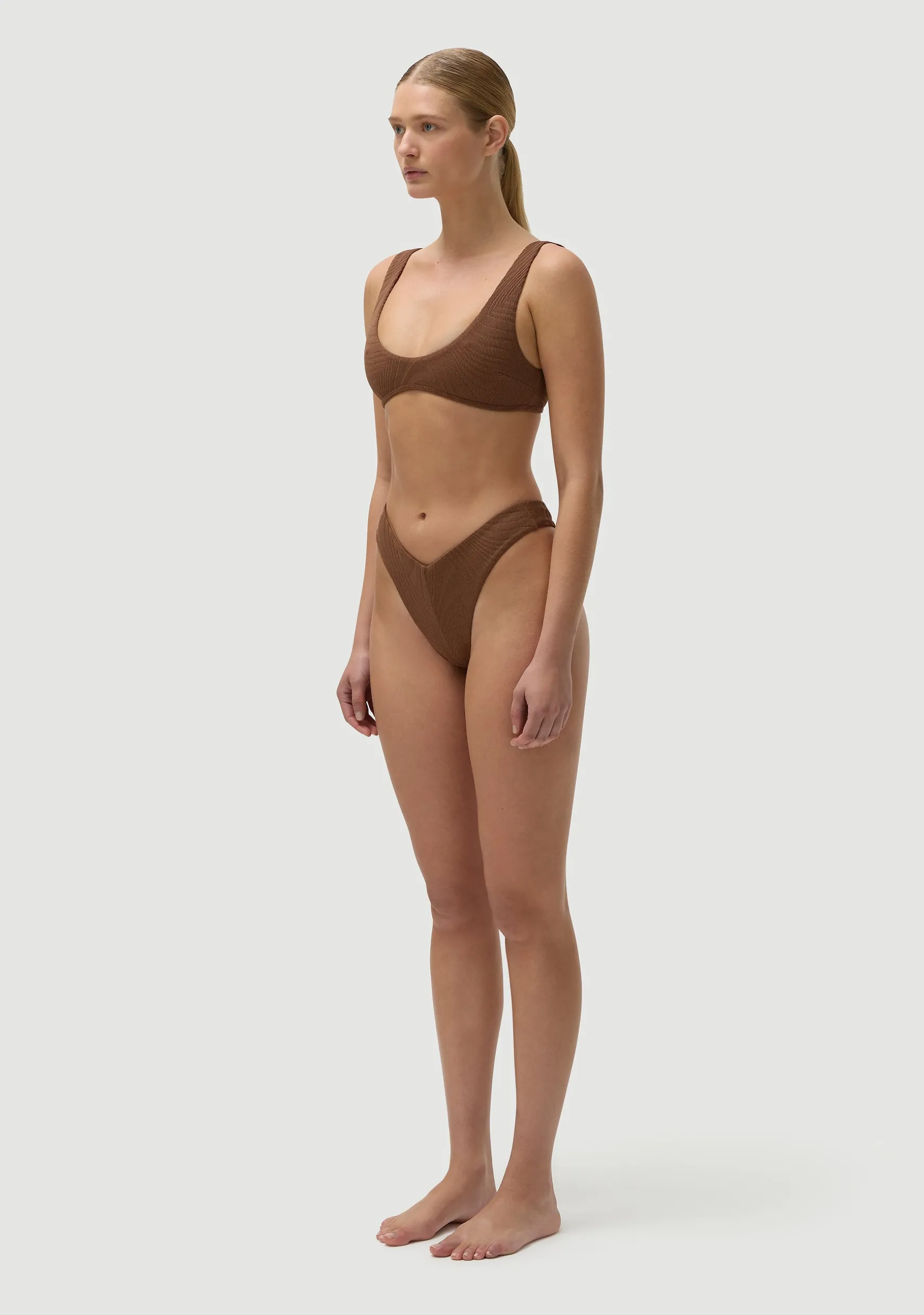 Medium coverage around the body but a low scoop neckline.