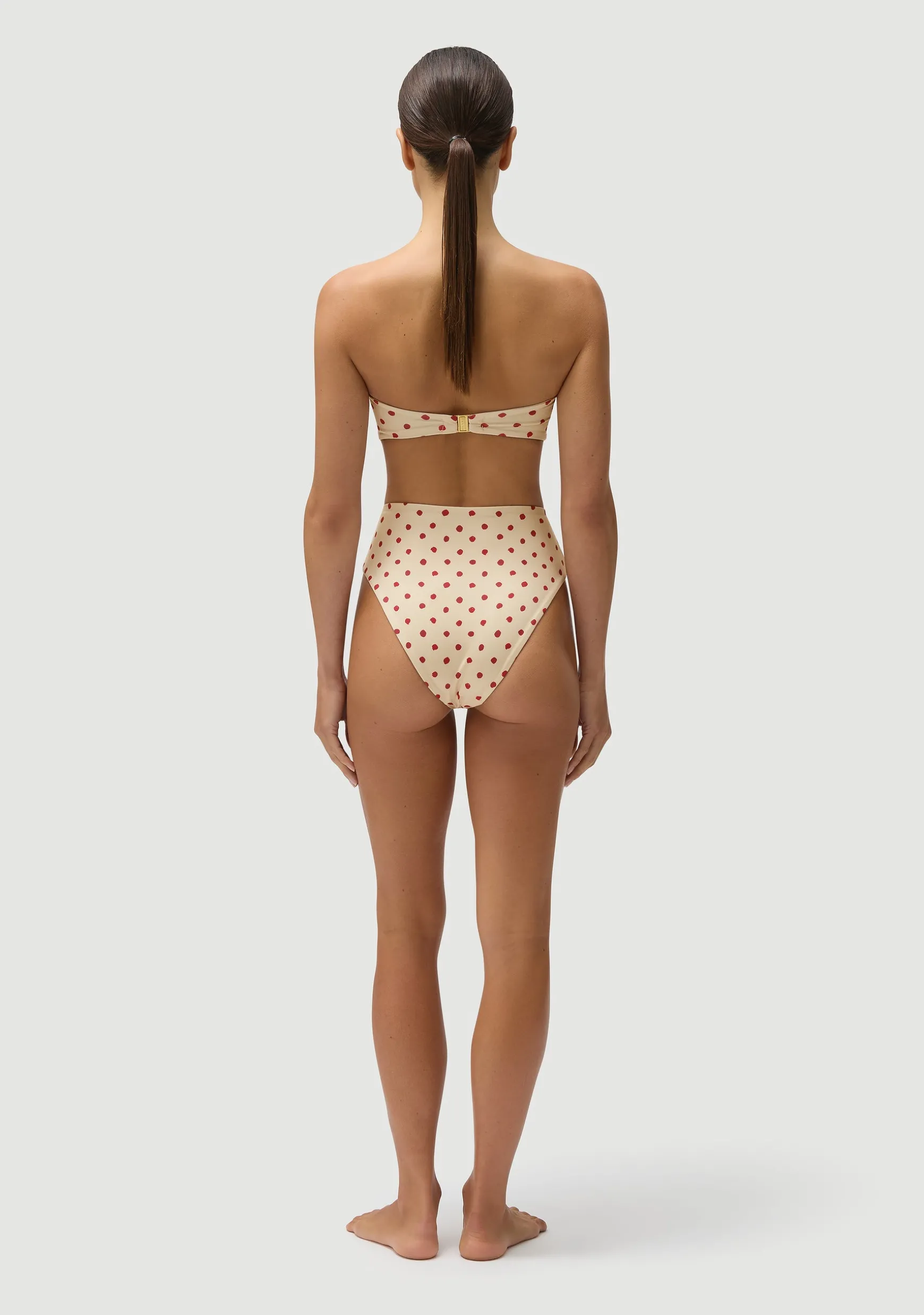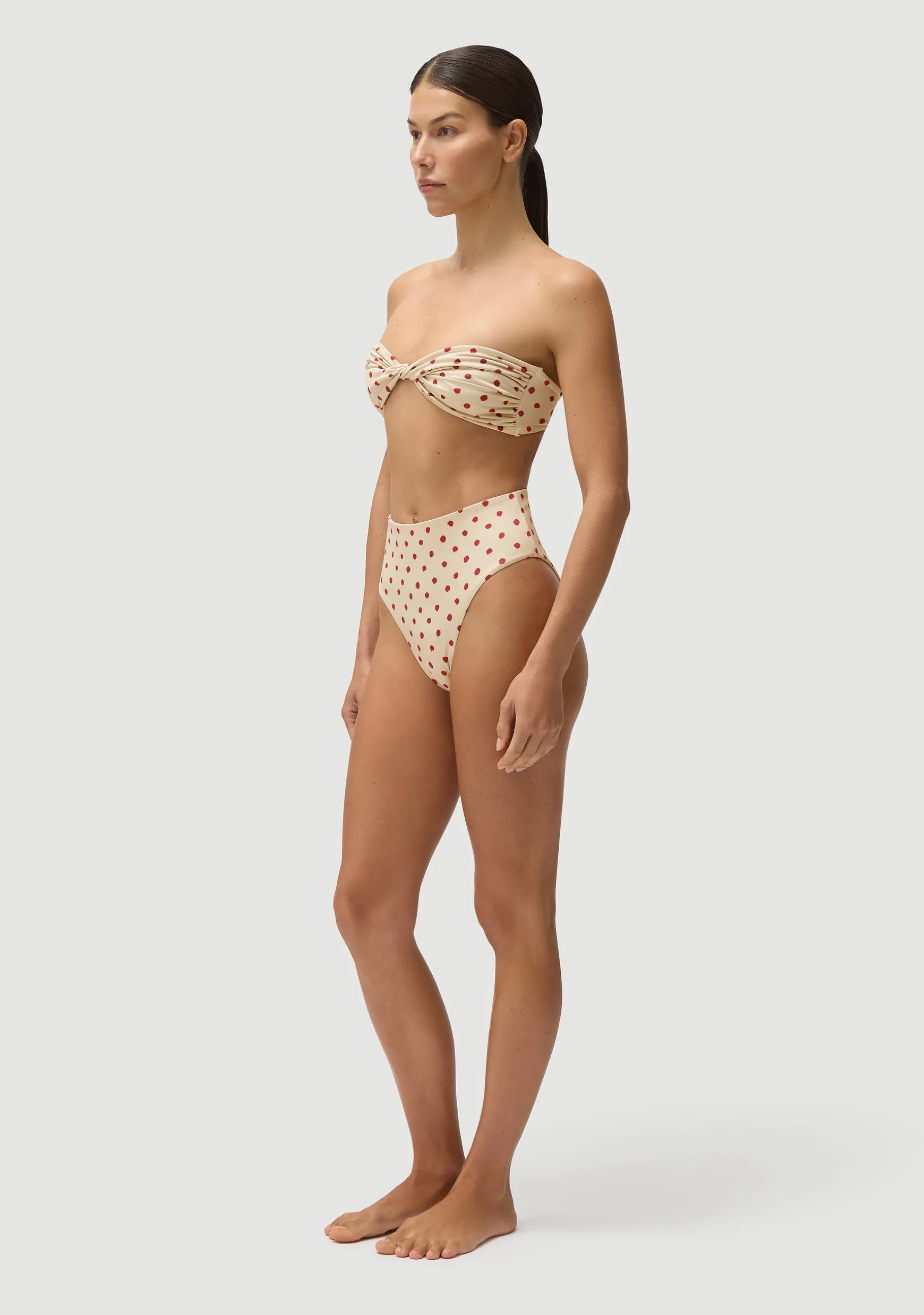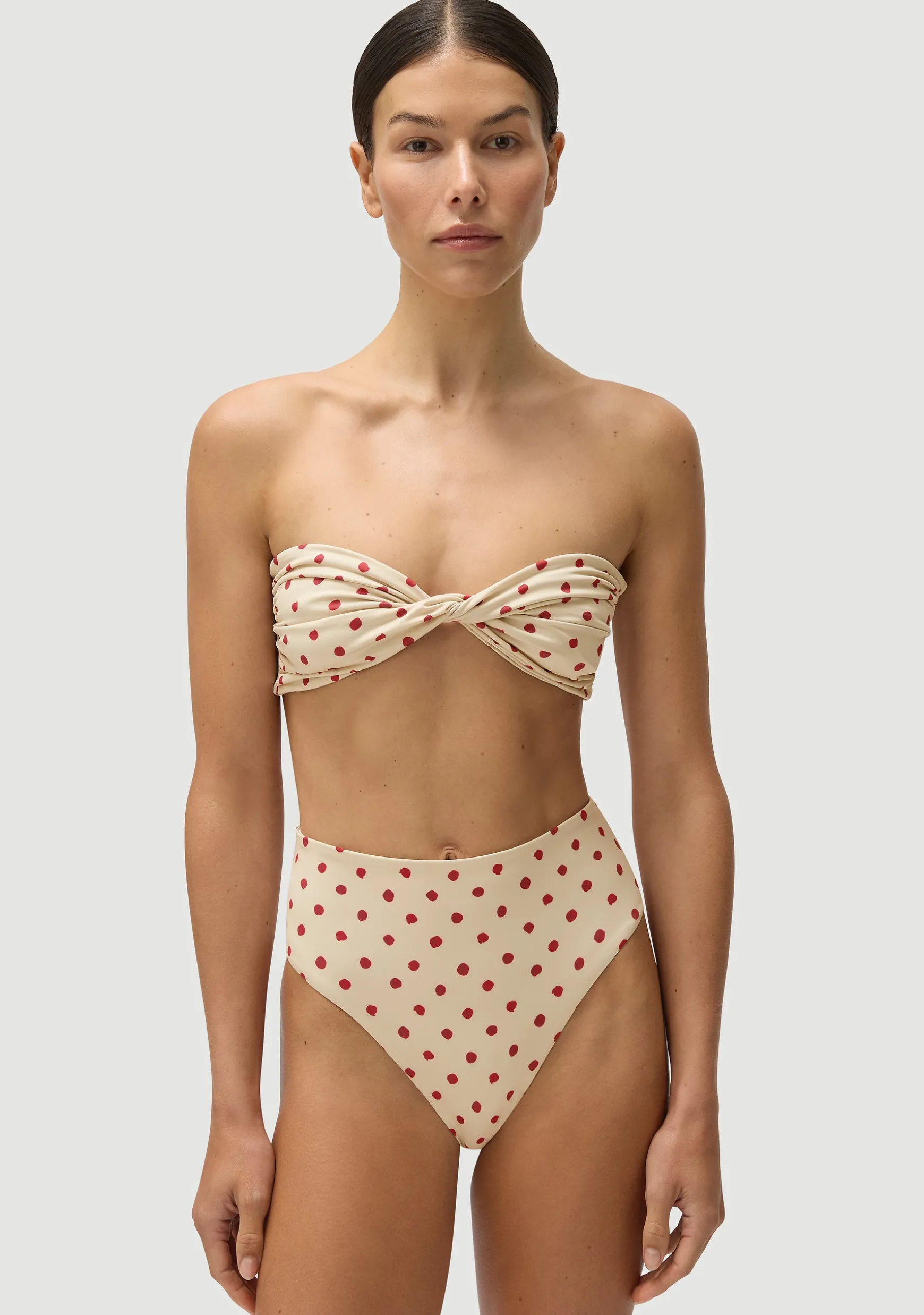 Double twisted, bandeau top. Boned side seams. Best suited for bust cups A, B and C (size XS to M).