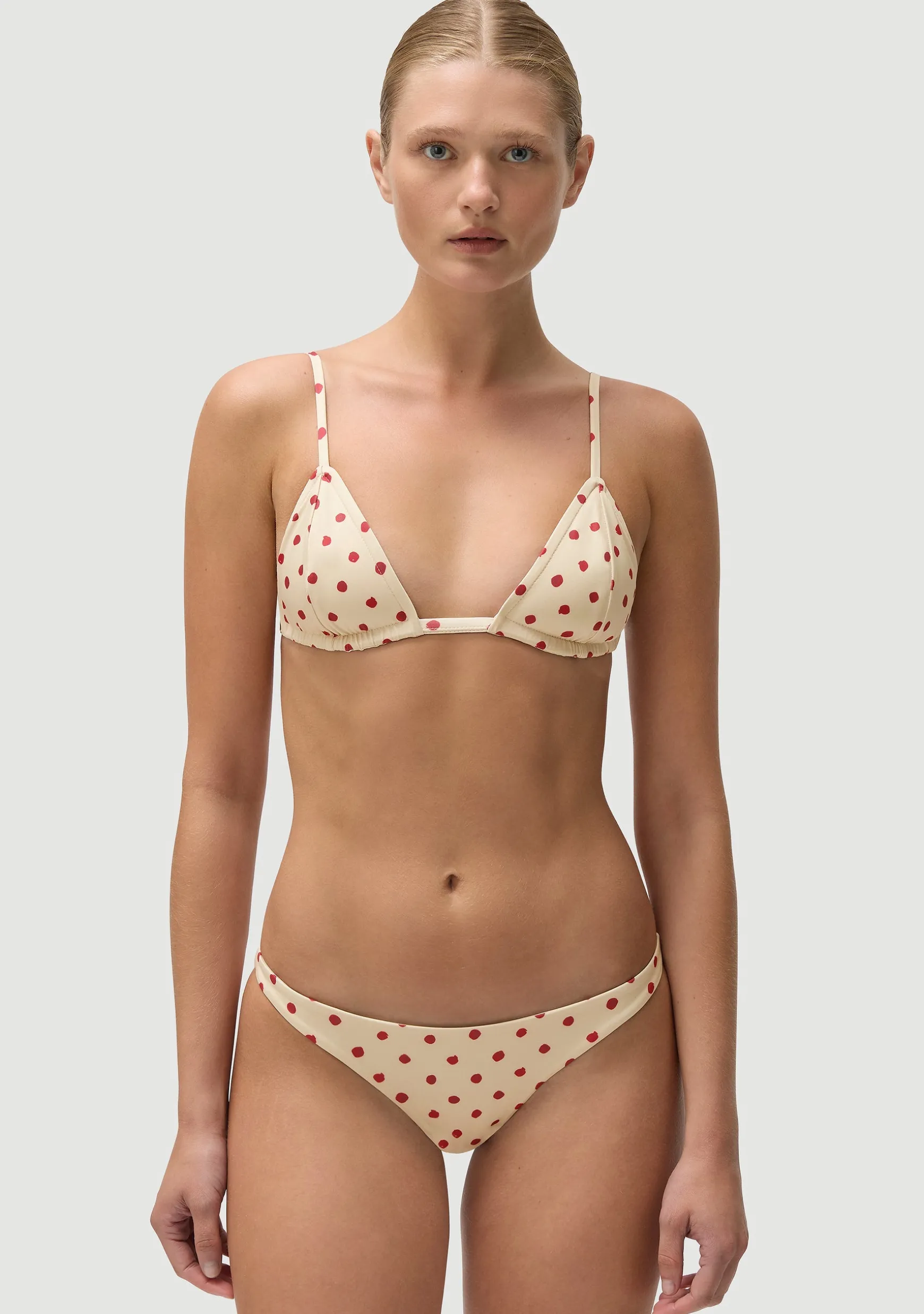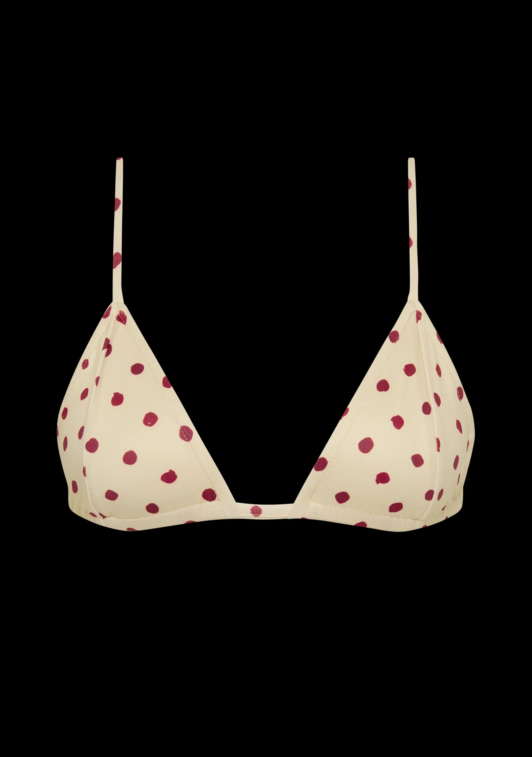Tailored triangle bikini (no ties). Adjustable shoulder straps and back clasp.