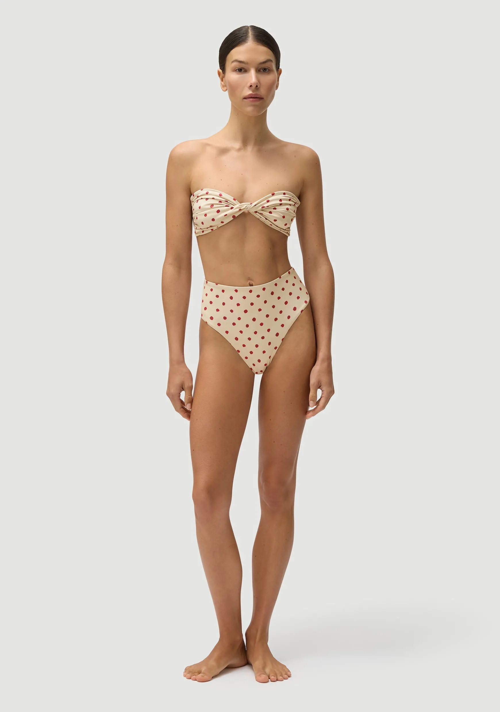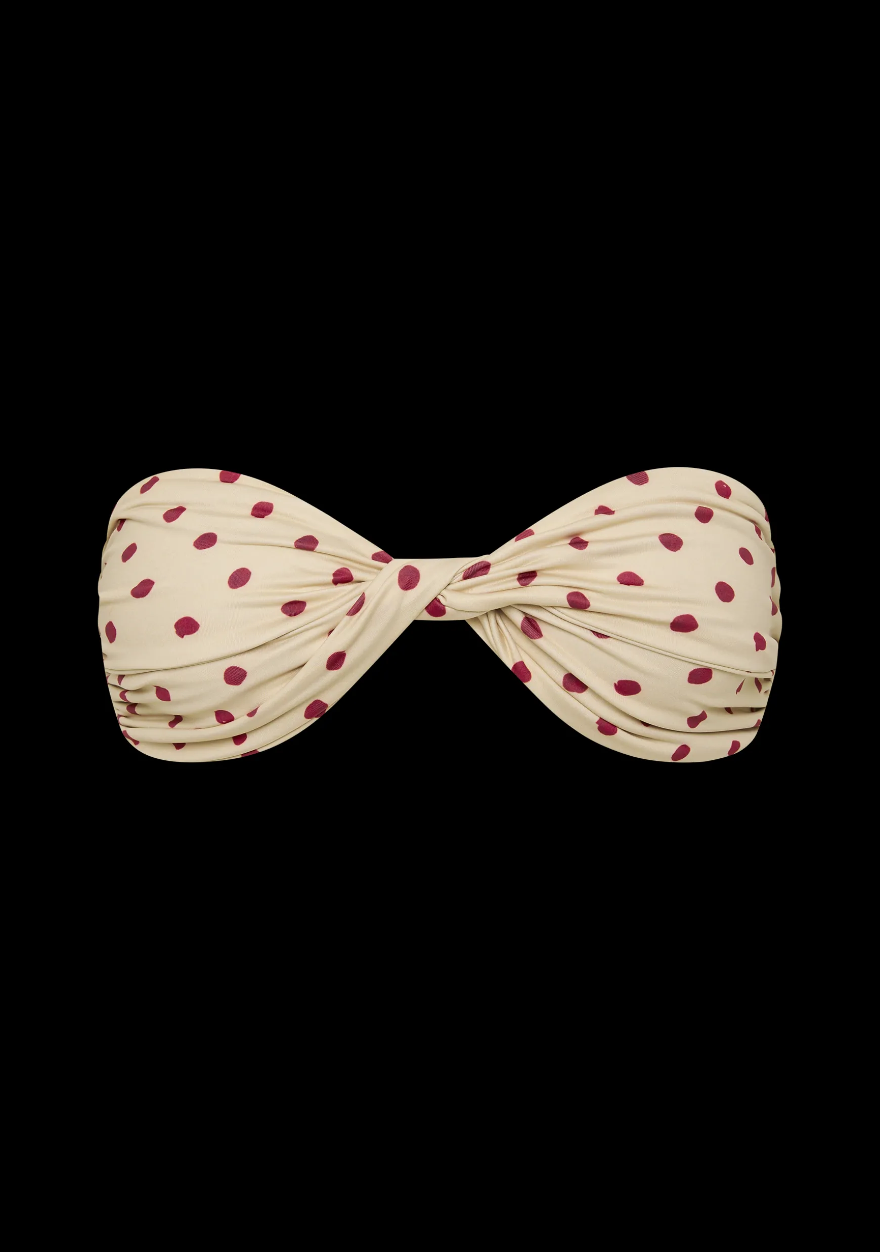 Double twisted, bandeau top. Boned side seams. Best suited for bust cups A, B and C (size XS to M).