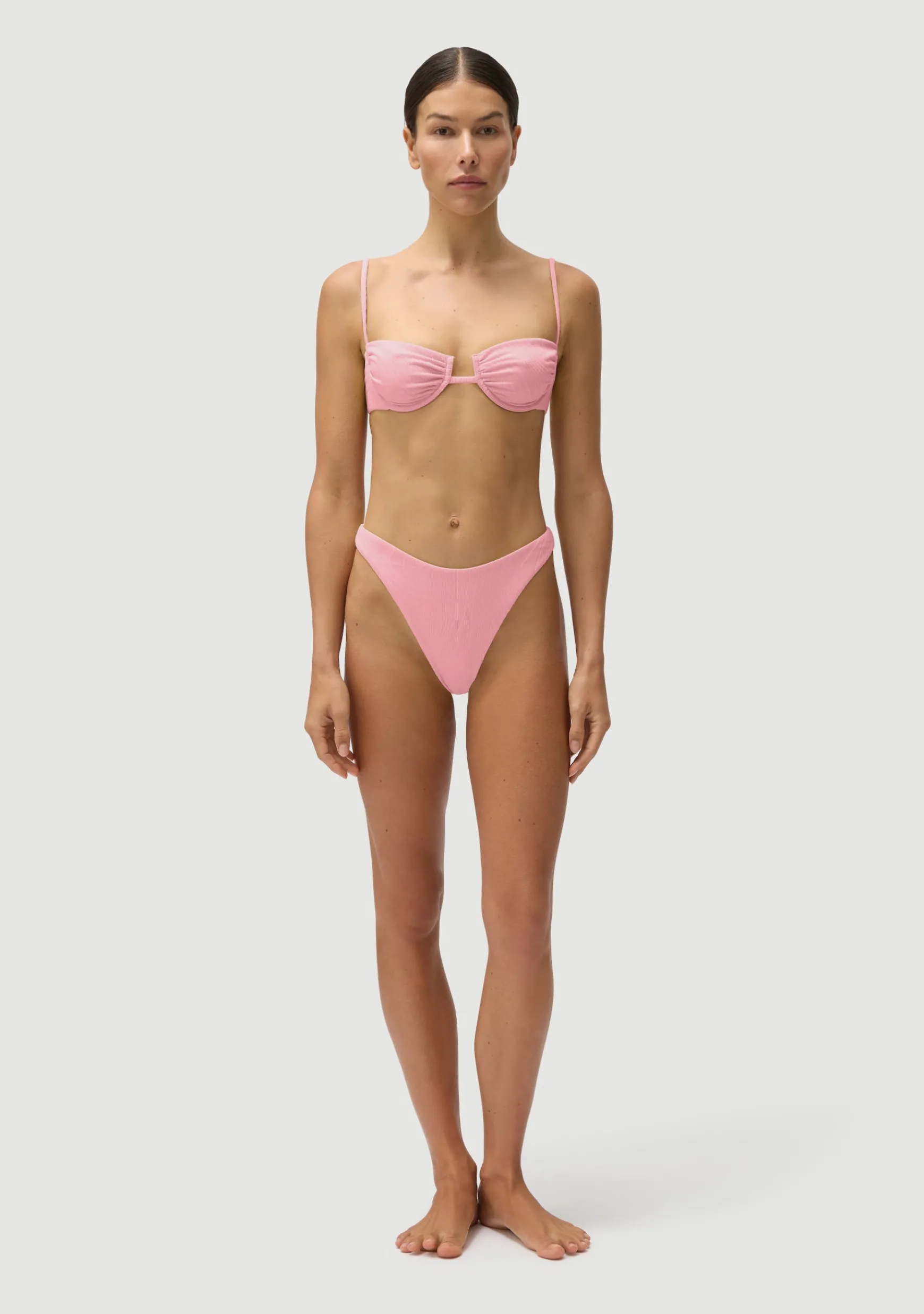 High-cut 90s classic thong. Elongates the legs and draws in the waist.