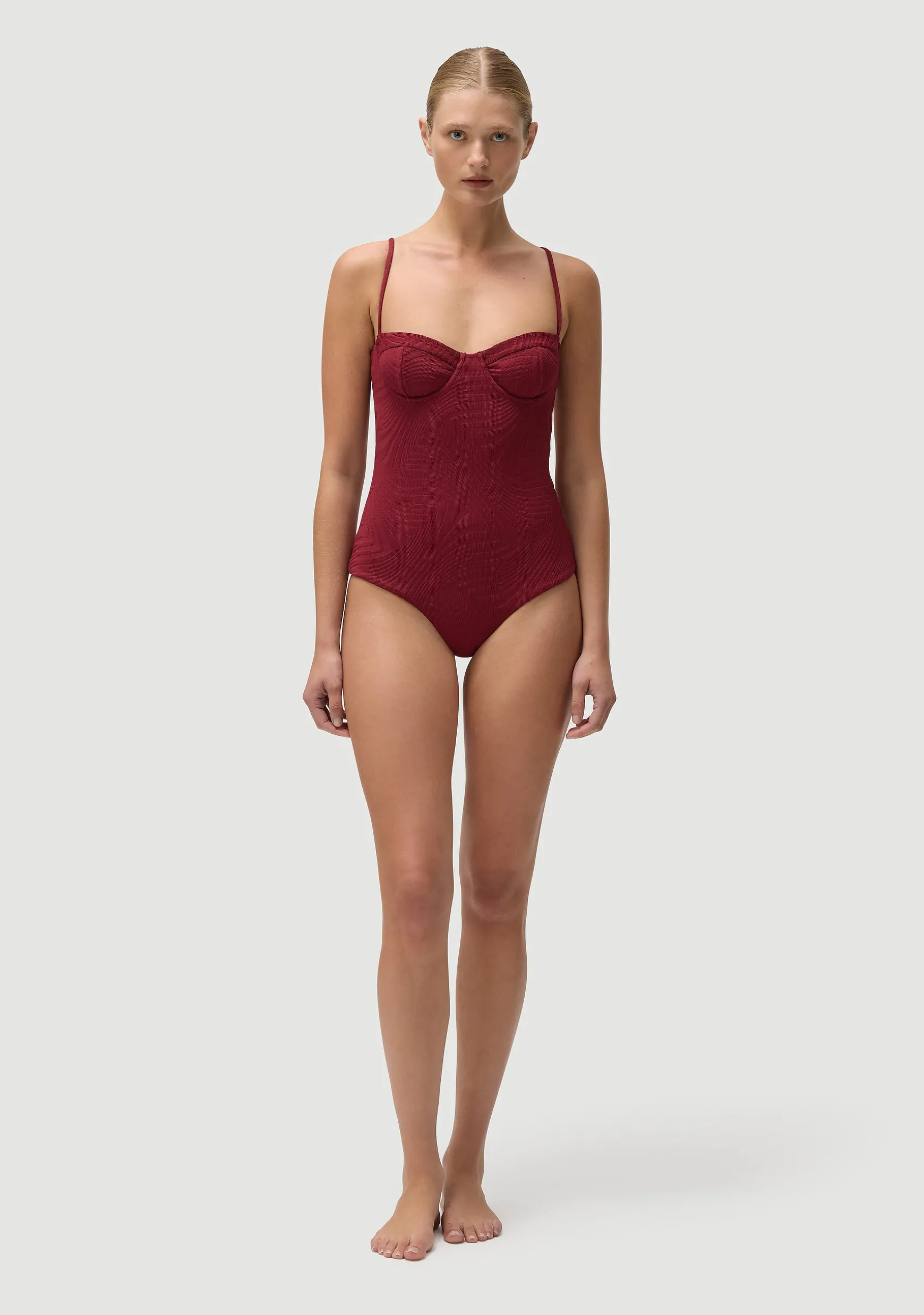 A contoured, underwired one-piece with a scoop back. Adjustable shoulder straps and back clasp.