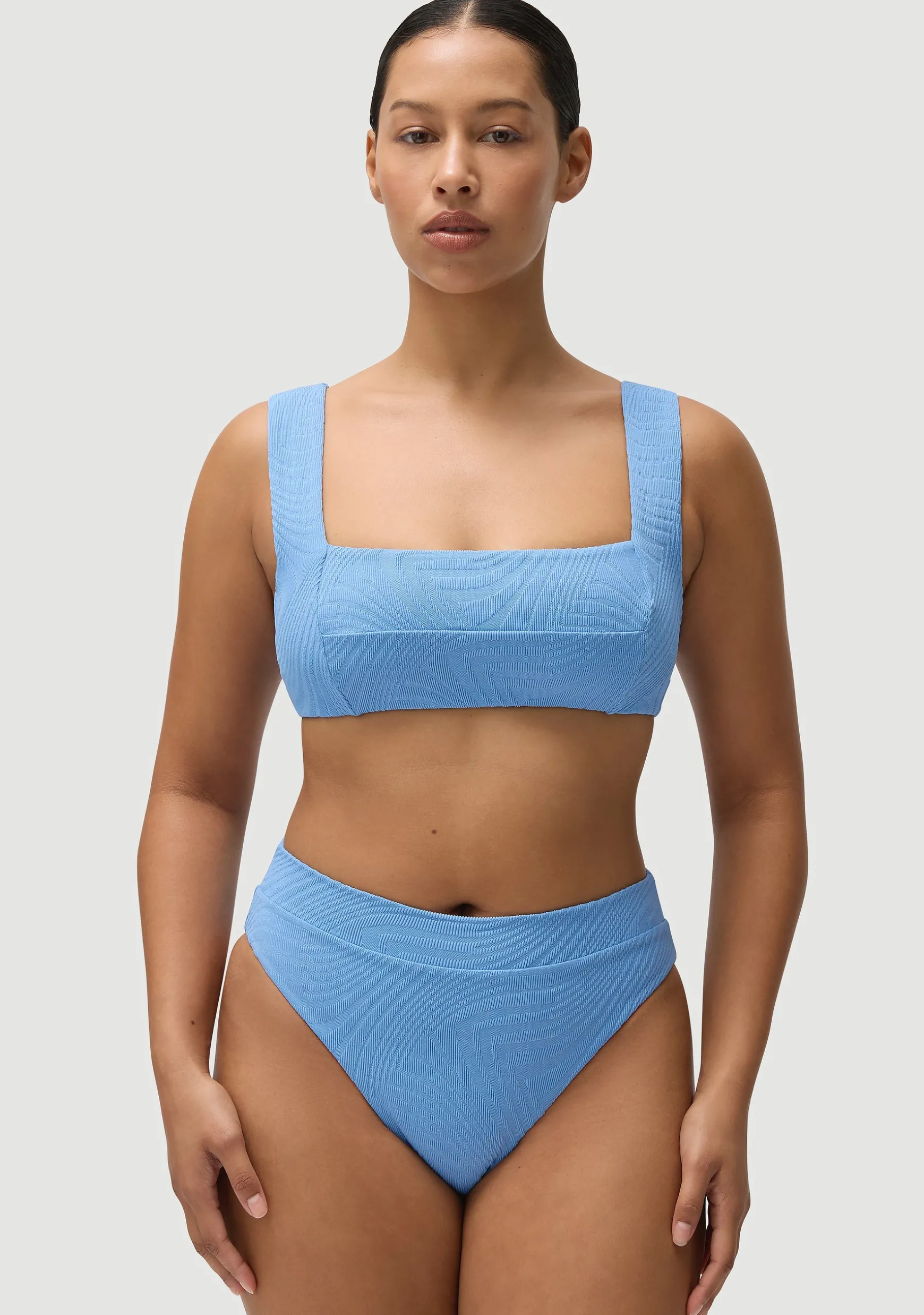 A structured bandeau crop top with thick shoulder straps.