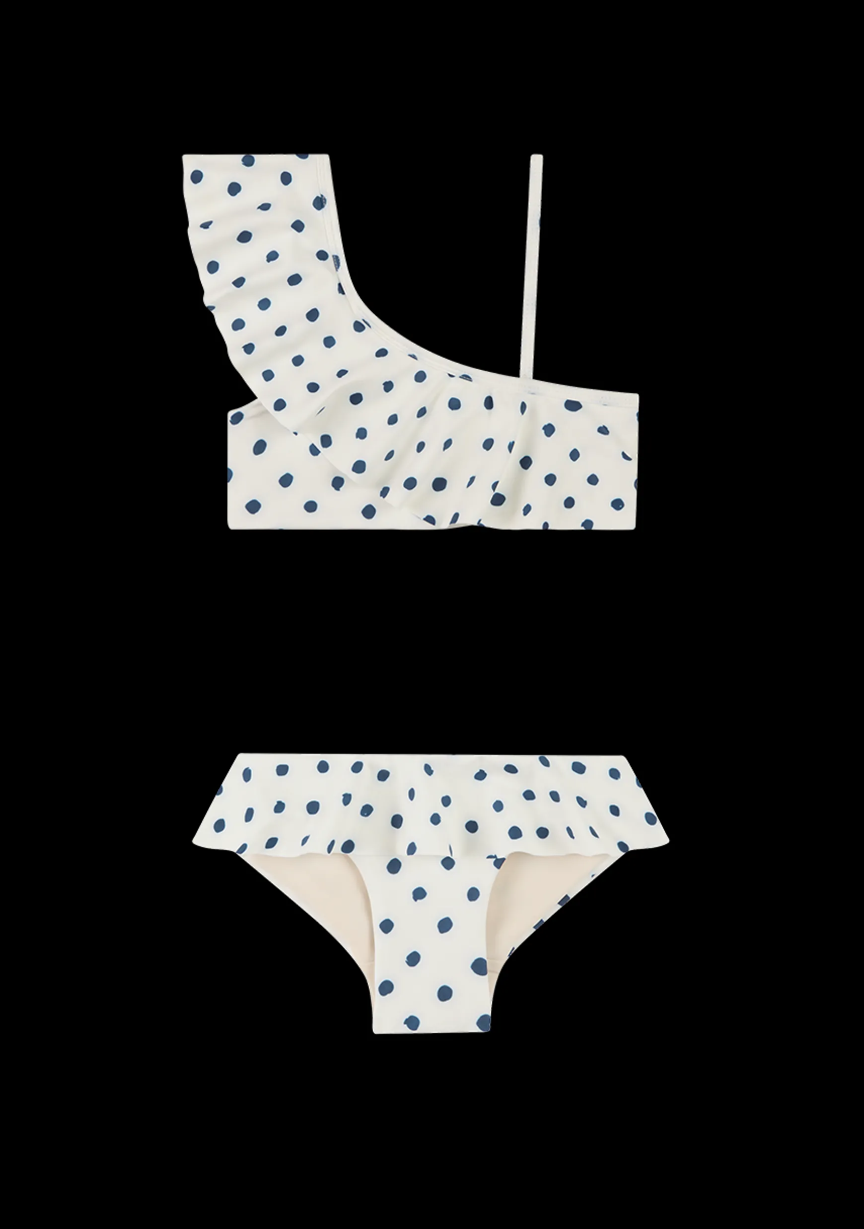 An asymmetrical shoulder two-piece swimsuit. Crafted from eco cloud Lycra and finished with charming ruffle details.