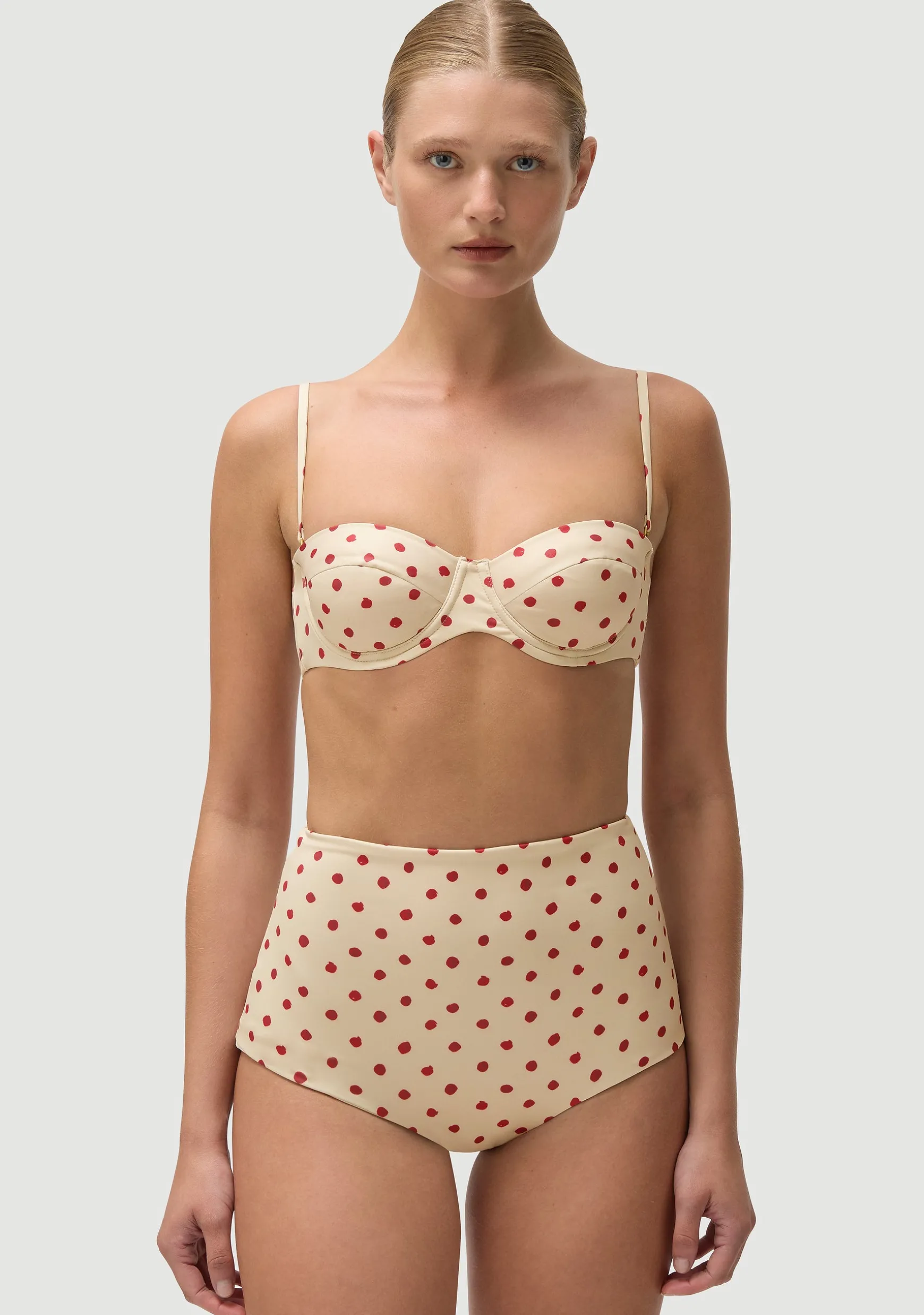 An underwired bra style top with light padding. Best suited for B cup (size S) and larger. Medium coverage, extremely supportive. Fully lined.